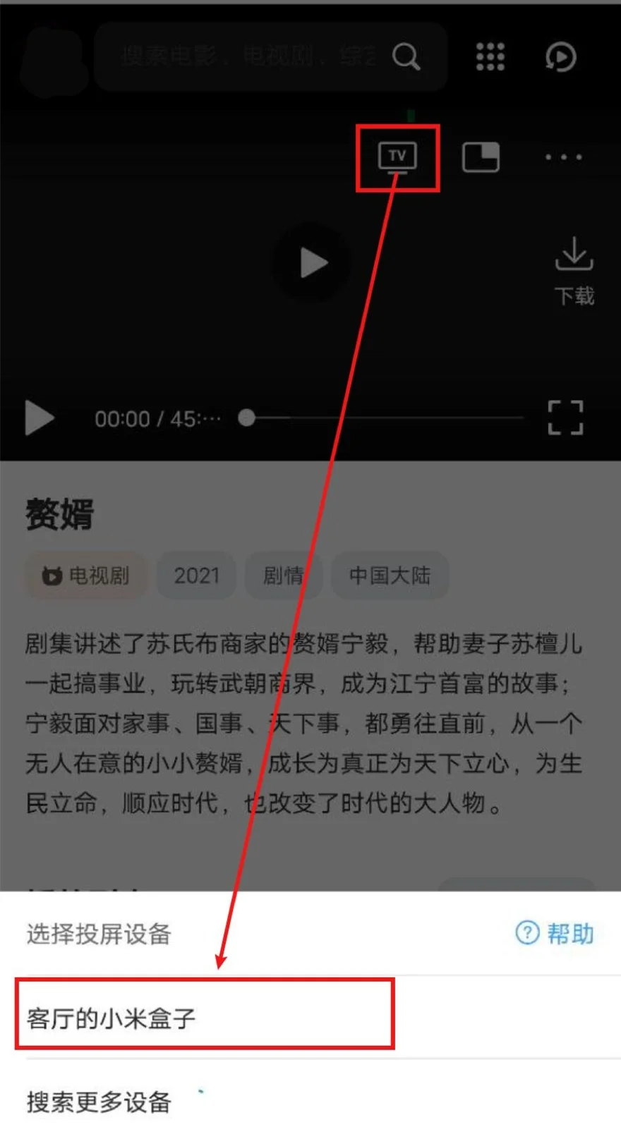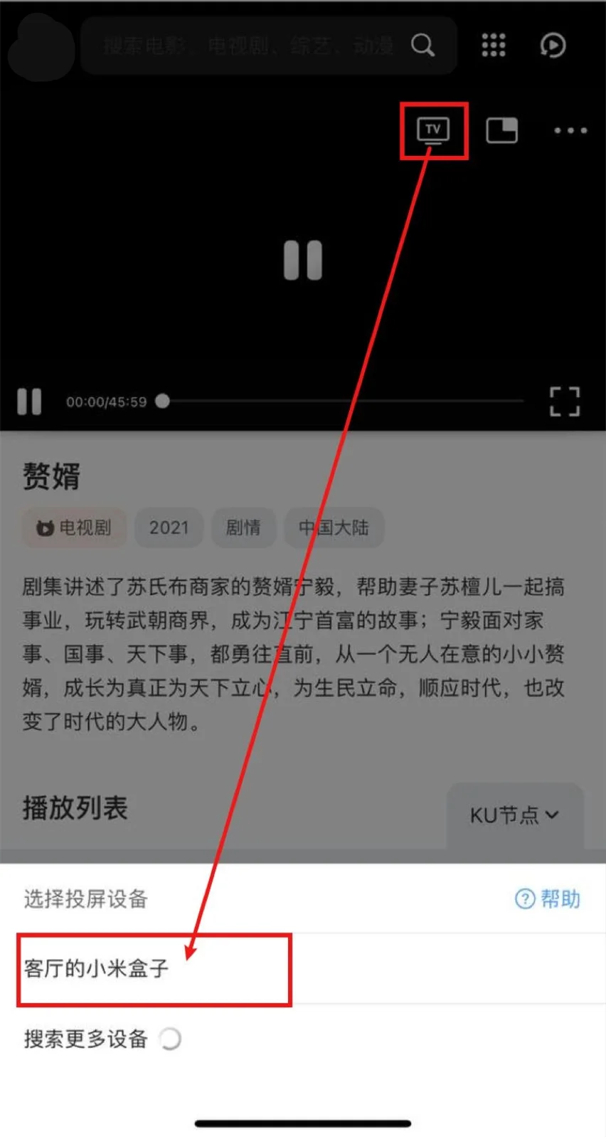 打开QQ浏览器(会接管网页播放器)->打开彗星影视->播放视频->选中投屏图标->等待搜寻出智能电视/电视盒子->选中,即可投屏。